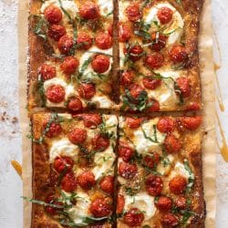 This delicious tomato hot honey ricotta tart is a dream! Flaky, crisp crust, melty cheese, creamy ricotta, burst garlicky tomatoes, basil, and parmesan come together before a drizzle of hot honey is added on top. It's delish!